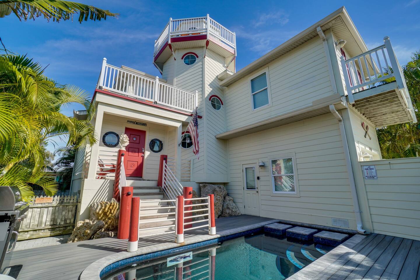 Discover this unique lighthouse vacation rental w/private pool on Anna Maria Island. The Lighthouse has 3 bedrooms, 2.5 baths with an open plan living/kitchen/dining which is perfect for a family vacation or getaway with friends. Located in Holmes Beach, the home is only a short walk (approx. 6 min) to the beautiful Gulf beach. The house has been lovingly decorated with retro memorabilia creating a vintage americana aesthetic. Enjoy our 2020 budget-friendly pricing.